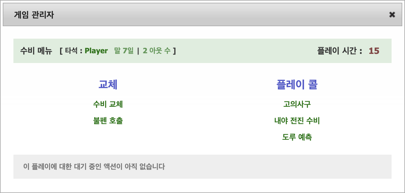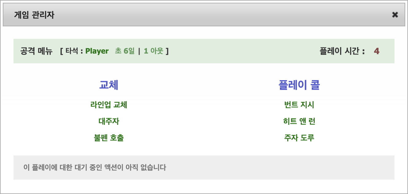 게임 관리자에는 공격 및 수비에 따라 두 가지 메뉴가 있습니다. 메뉴의 왼쪽은 교체 작업에 해당하고 오른쪽은 플레이 호출 작업에 해당합니다. 게임이 실시간으로 진행되기 때문에 현재 투수/타자 매치업에 대한 플레이 기간 동안 현재 투수/타자 매치업에 대한 조치를 큐에 넣을 수 있습니다. 각 플레이는 60초(큐에 넣을 시간은 55초이고 플레이 완료 후 5초가 남습니다). 조치를 큐에 넣은 후에는 취소할 수 없습니다. 현재 플레이에 대한 모든 큐에 넣은 작업을 메뉴의 하단에 볼 수 있습니다. 모든 큐에 넣은 작업은 게임이 끝날 때까지 당신의 팀에게 트리거될 수 있는 어떠한 구급 상황도 취소합니다.